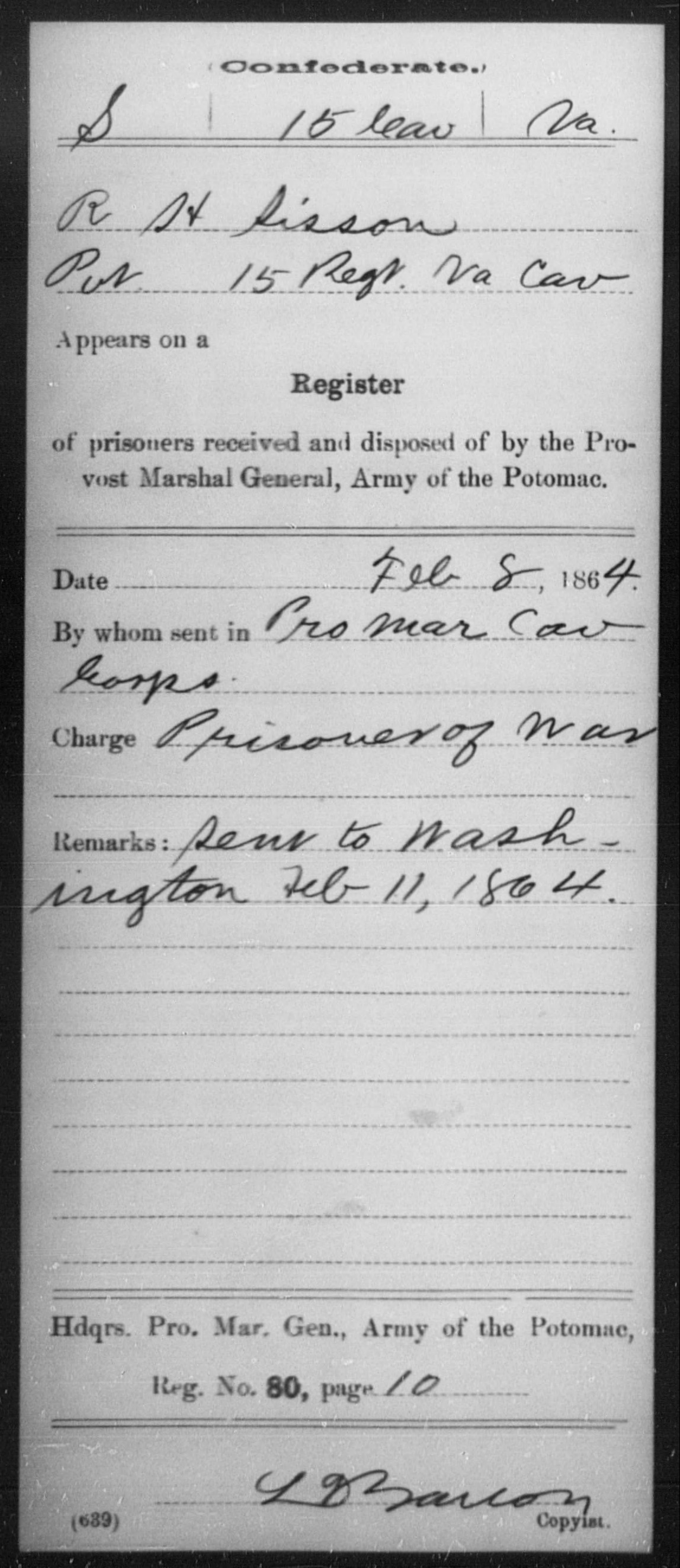 - February 1864 Prisoner Register - 15th VA Cavalry Co. D.