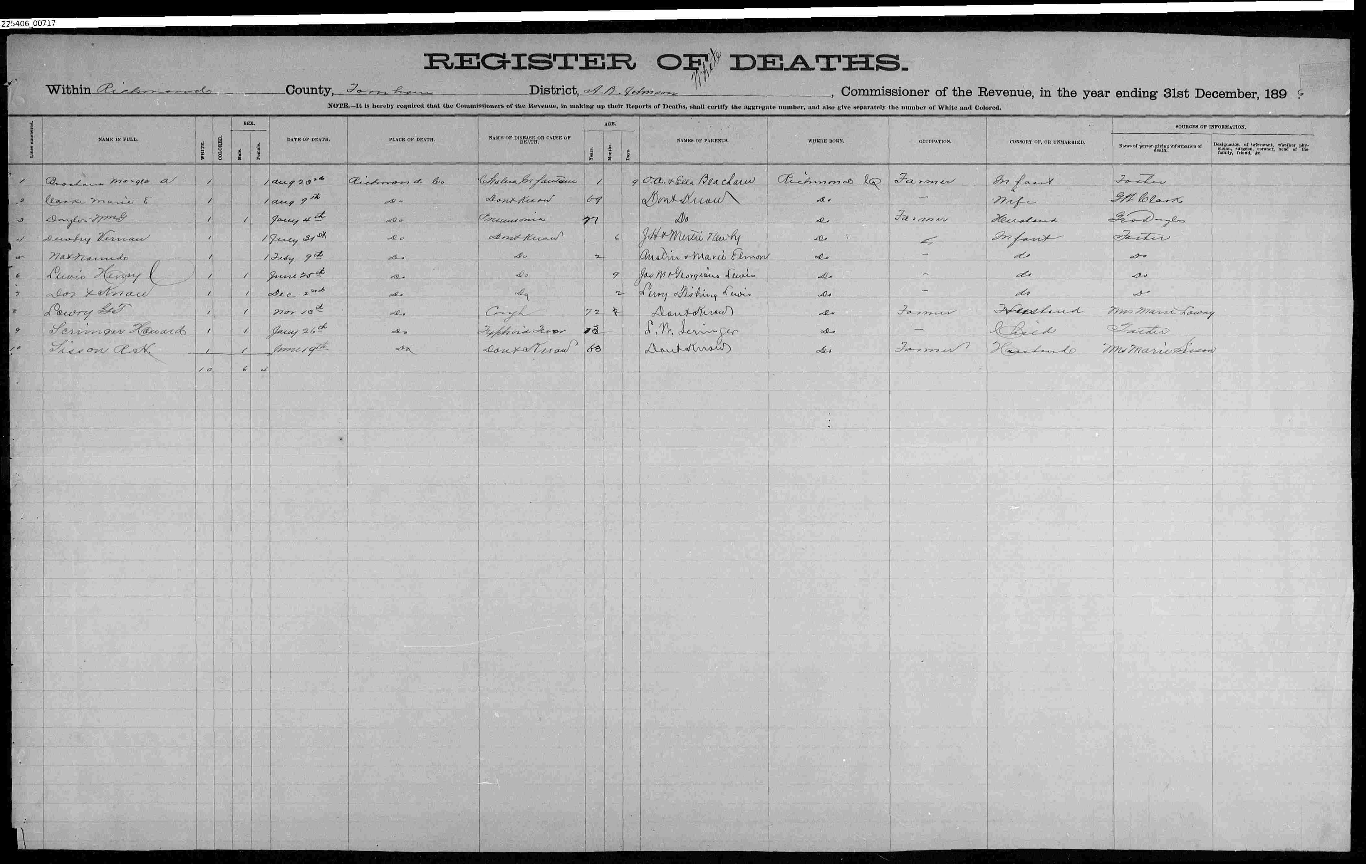 - Year: 1880; Census Place: Farnham, Richmond, Virginia; Roll: 1386; Family History Film: 1255386; Page: 397B; Enumeration District: 096